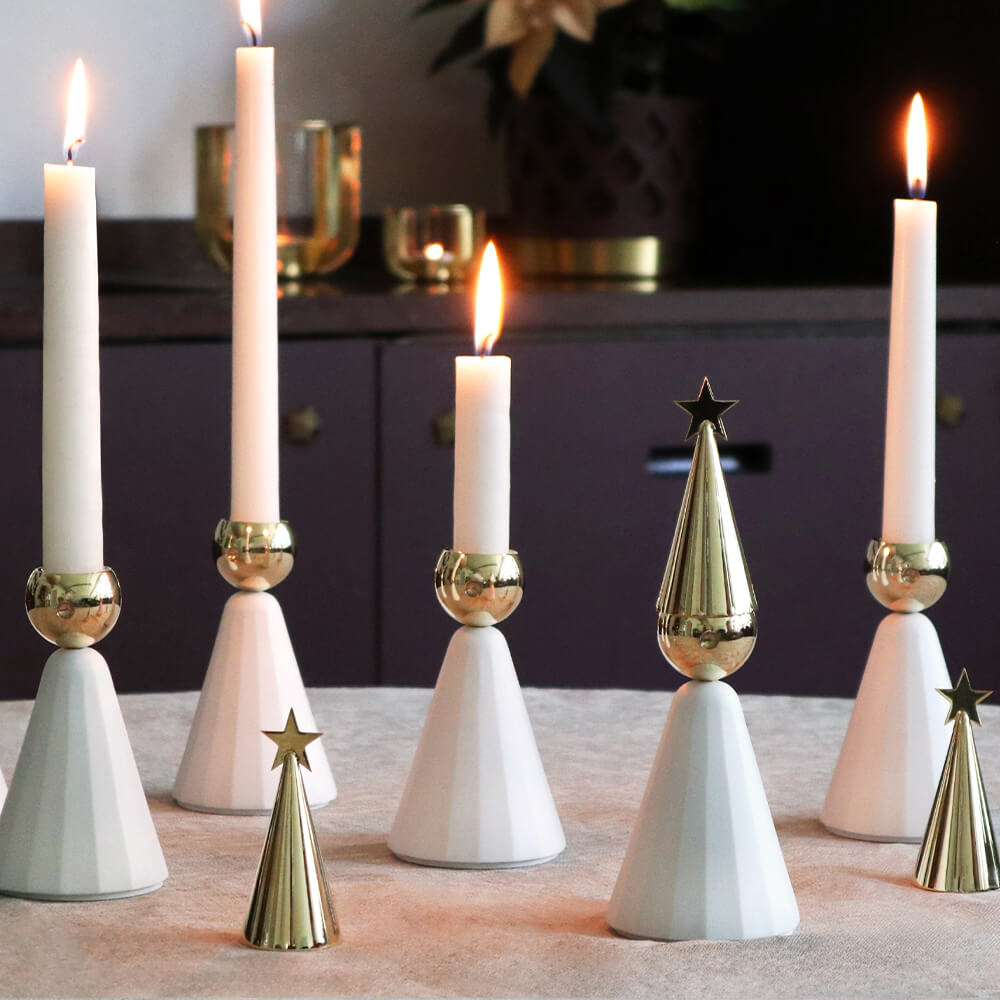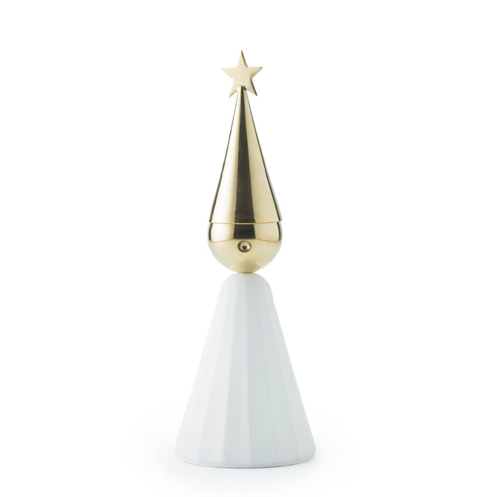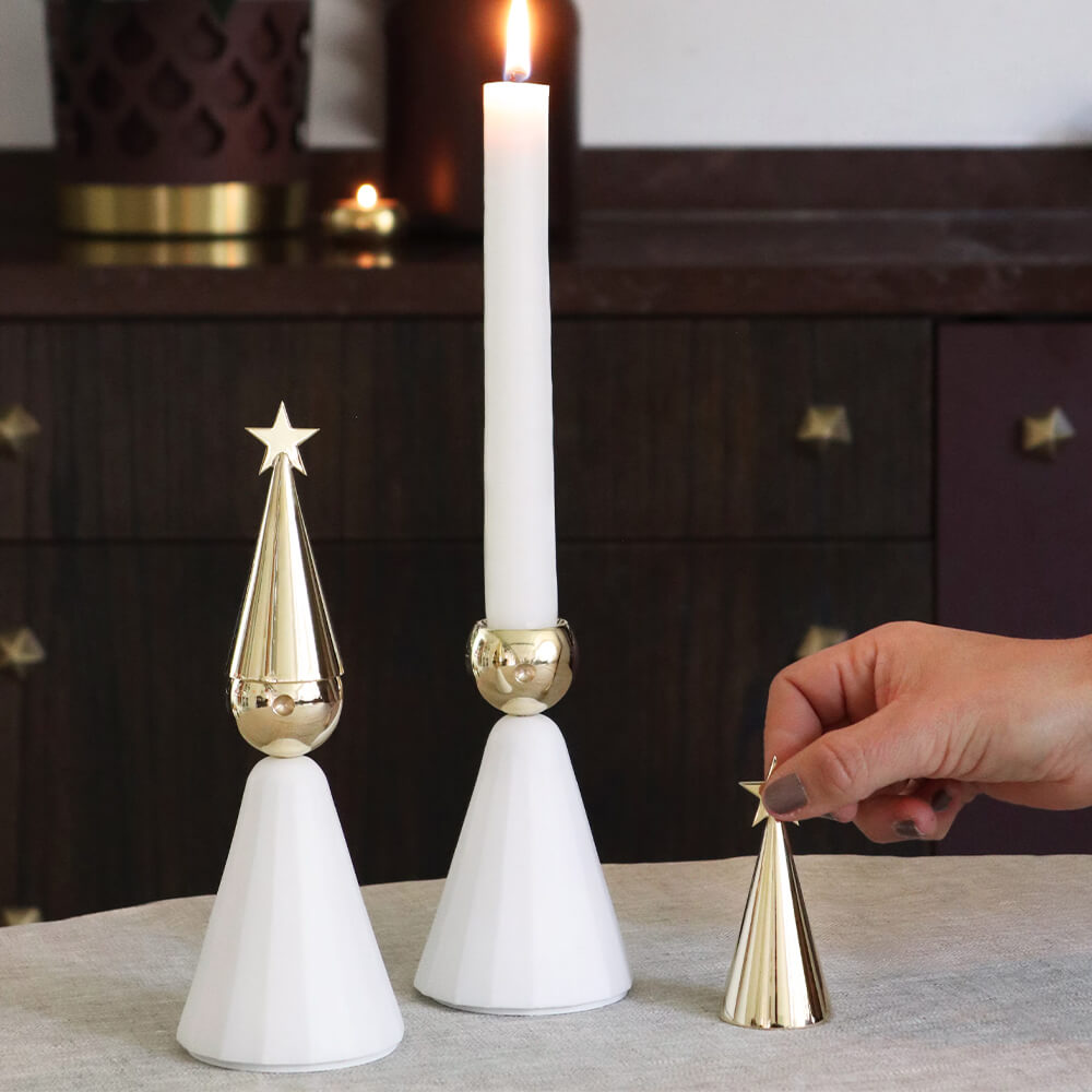 Soprano är en tidlös ljusstake med en matchande ljussläckare från Klong. Med sina mässingsdetaljer och vita hölje påminner Soprano om en körpojke i ett traditionellt luciatåg. Körpojkehatten fungerar både som ljussläckare och som en dekorativ topp när ljuset har brunnit ner. Tillsammans bildar de en elegant, lekfull och unik duo som sprider värme och ljus. Med hatten placerad bredvid påminner Soprano oss om att aldrig lämna ett brinnande ljus obevakat. En omtänksam och charmig gåva – eller ett personligt tillskott till din egen jultradition. Med sin lekfulla och eleganta form passar den perfekt både på middagsbordet och i fönstret, där den sprider ett mjukt ljus i vintermörkret. Ljussläckaren säljs även separat under namnet Stjärnstopp.
