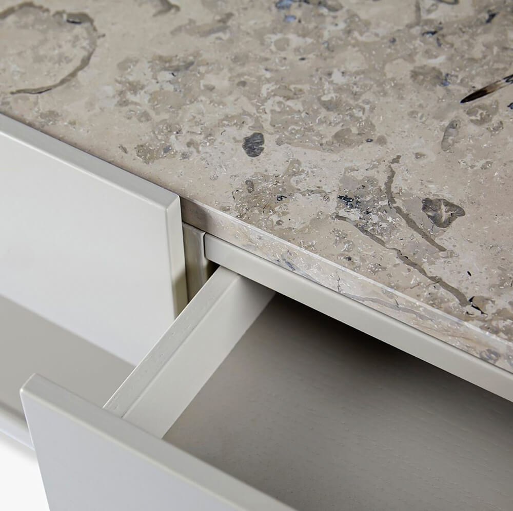 LUC Console 160 är ett sidobord formgivet av Broberg & Ridderstråle för ASPLUND Collection. Toppskiva i trä eller sten, mittenhyllan och lådorna är av lackad MDF och knopparna av mässing. Underrede är i lackad metall i samma färg som lådorna. Tillverkas i Sverige.