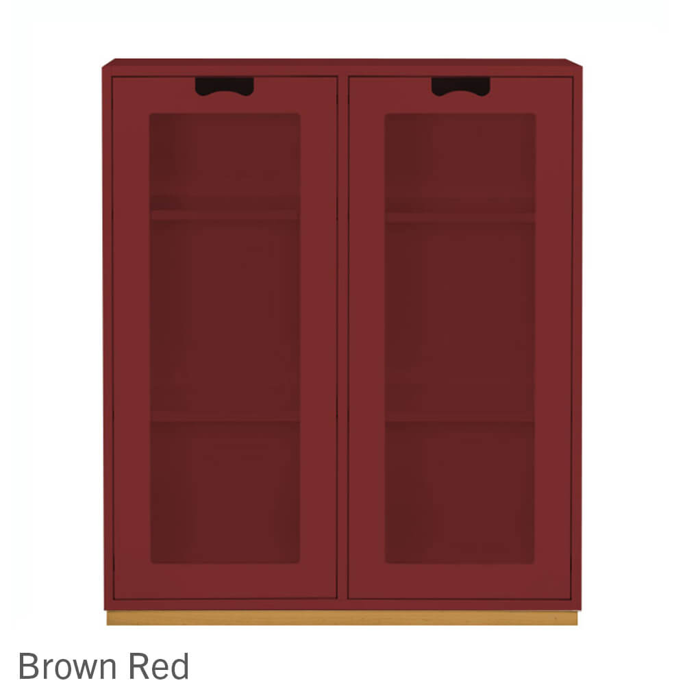 Byrån har mjukstängande glasdörrar, en väggdelare, 2 hyllplan på vardera sida samt eksockel. Kommer med tippskydd.